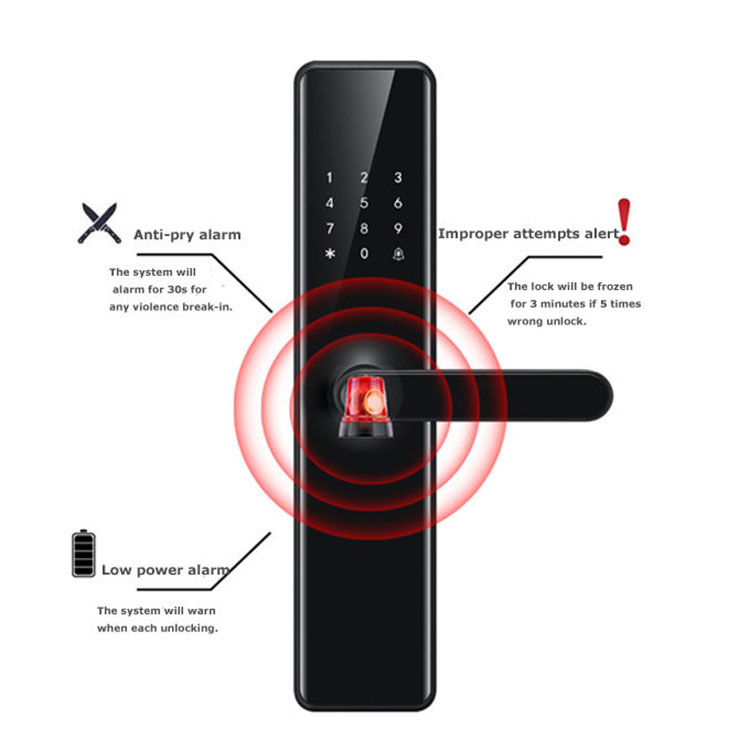 ఎవరైనా తప్పు కోడ్/ఫింగర్ ప్రింట్/కార్డ్లో 5 సార్లు ప్రవేశిస్తే, ఈ స్మార్ట్ లాక్ స్వయంచాలకంగా 3 నిమిషాలు స్తంభింపజేయబడుతుంది.